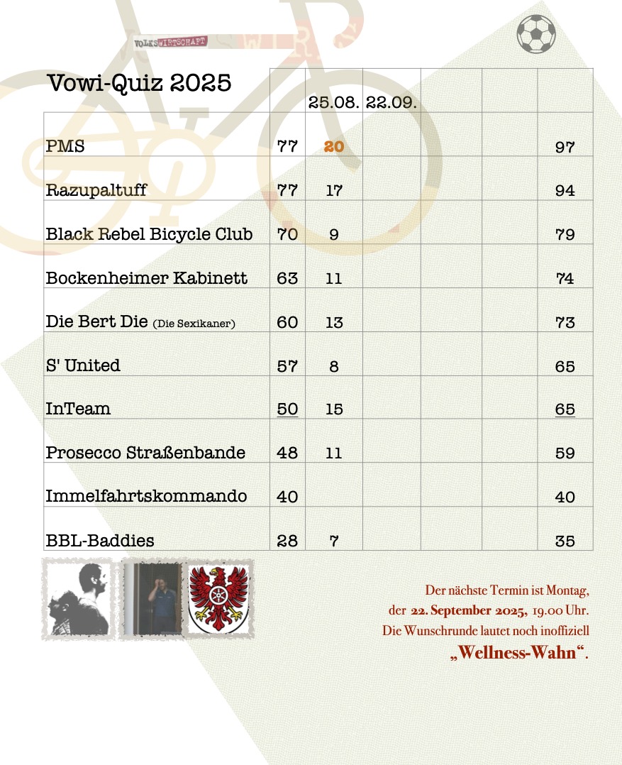 Am Montag, am 08.12.25, ab 19.00 Uhr findet der nächste Quiz in der Vowi statt.