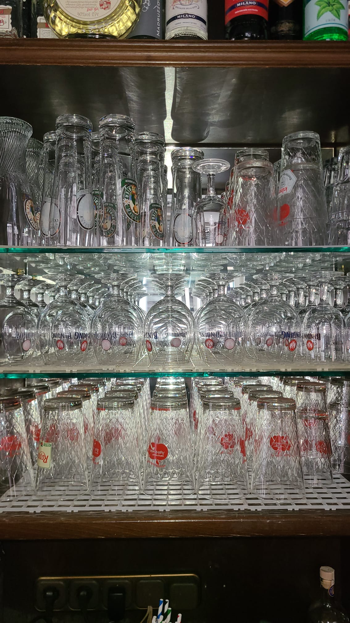 Wieviel 0,5 Liter Apfelweingläser stehen im unteren Regal am Tresen der Volkswirtschaft?