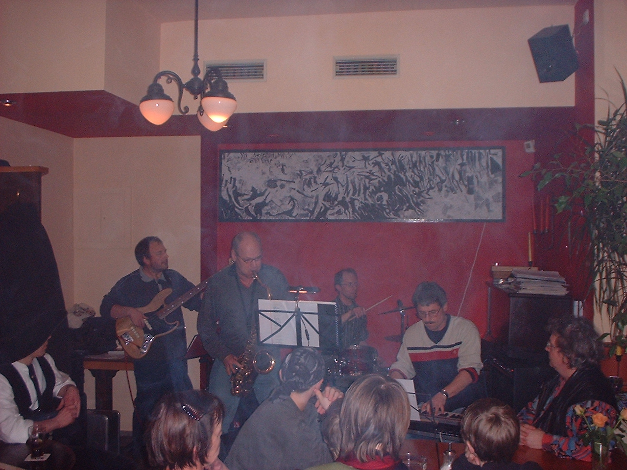Diesmal spielten diese vier Jazzmusiker – durchaus nicht zu leicht- wie man ihrem Bandnamen nach vermuten könnte,- auf: Hartmut Prescher Tenorsaxophon, und seine Kumpanen am Bass, dem Piano und dem Schlagzeug. Aus ihrem vielseitigen Jazzrepertoire wählten sie für diesen Abend klassische Kompositionen im Bossa-Nova-Rhythmus, die man kennt, auch einige Stücke im kräftigeren Sound des Swings der 30er und 40er Jahre. „Sich erinnern, was gut ist“; so steht’s auf ihren Programm; und so steht’s auch im Programm der Vowi, ob es sich um die stets hausgemachte Küche des Lokals oder die eher rar gewordenen Erfolge der Frankfurter Eintracht bezieht.