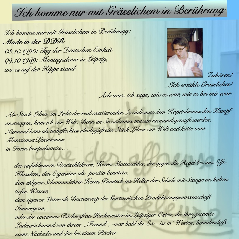 Als Stück Leben, im Licht des real existierenden Sozialismus dem Kapitalismus den Kampf anzusagen, kam ich zur Welt. Denn im Sozialismus musste niemand getauft werden.