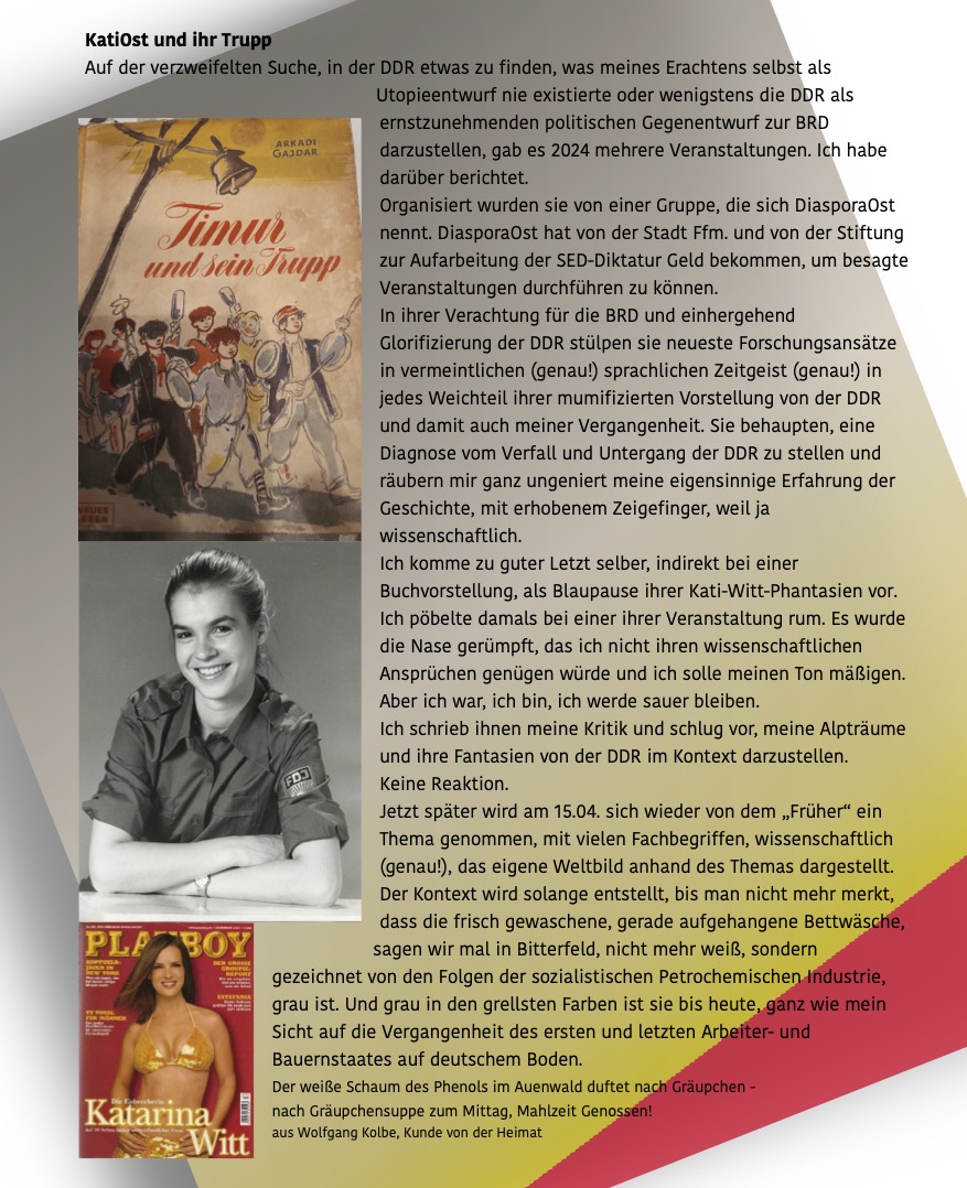 KatiOst und ihr Trupp 14. April 2026 von kmaass Schreibe einen Kommentar DiasporaOst Mail an DiasporaOst 26.03.2024, 11.04.2024 Zwischen den Jahren, 26.12.24 Erwischt beim Relativieren, 07.05.2025