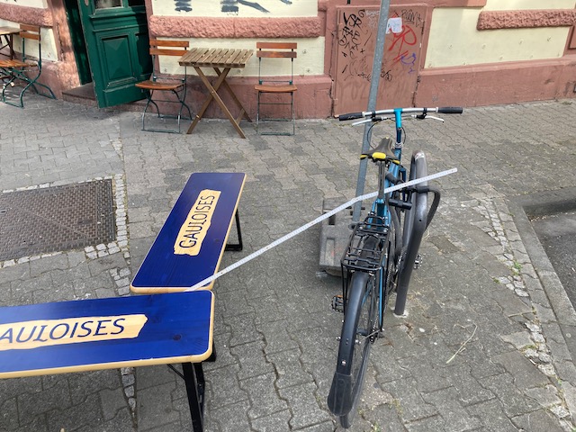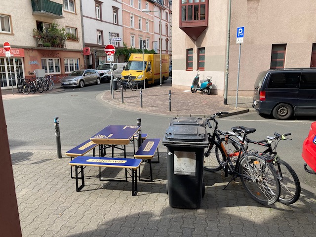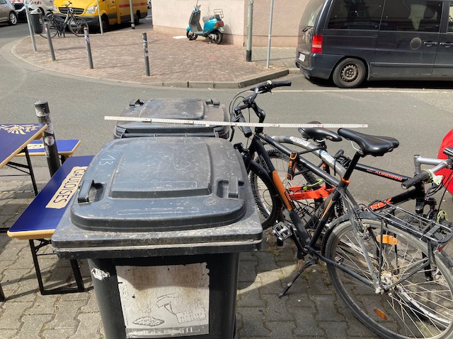 Und schließlich ist es für mich kaum zu kommunizieren, wenn ich meinen im Rollstuhl sitzenden oder mit Kinderwägen verweilenden Gästen, verwehre, draußen Platz zu nehmen, mit dem Argument, dass für sie Teile meines Sommergartens nicht vorgesehen sind. Sie also nicht ihre Kinderwägen neben die Radbügel stellen dürfen, da sonst sie selbst an ihre E-Lastenrad nicht rankommen. Nur ist so ein Rad so breit und so groß, dass es den vom Hessischen Wirtschaftsministerium vorgesehenen Platz für einen einzelnen stehenden Radbügel, ganz zu schweigen von nebeneinander stehenden Bügeln von 1,60 Quadratmetern klar übersteigt (Broschüre, S. 25). Auf dem Foto der Stadtpolizei ist dies im Hintergrund oben rechts gut sichtbar.